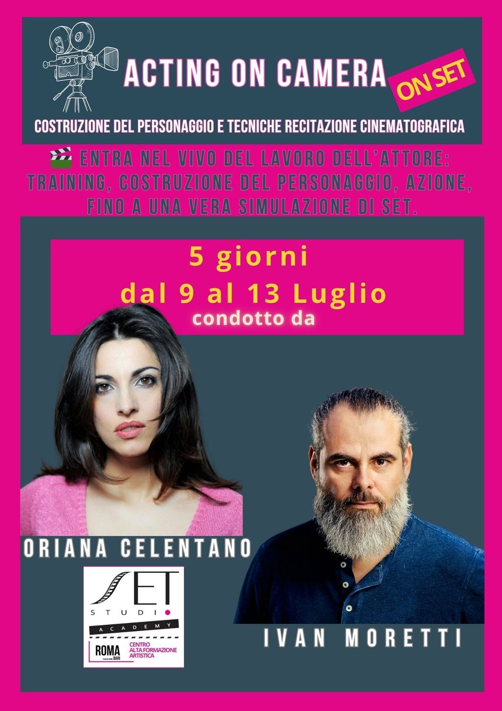 è un seminario intensivo di 5 giorni, per entrare nel vivo del lavoro dell’attore: training, costruzione, azione, fino a una vera simulazione su set, con riprese individuali e in gruppo.